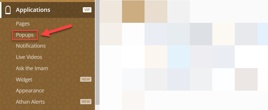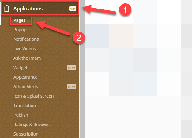 To add the Popup to the Applications page, you must go to the Applications⁽¹⁾, then Pages⁽²⁾.