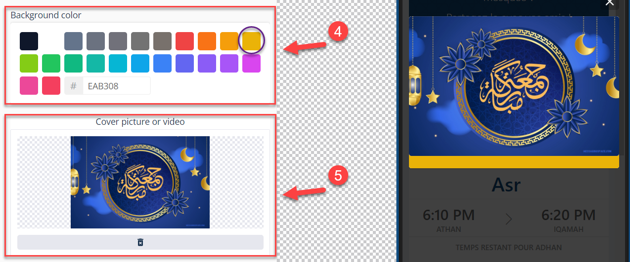 Select the color of the background⁽⁴⁾ & the cover picture or a video⁽⁵⁾ you want.