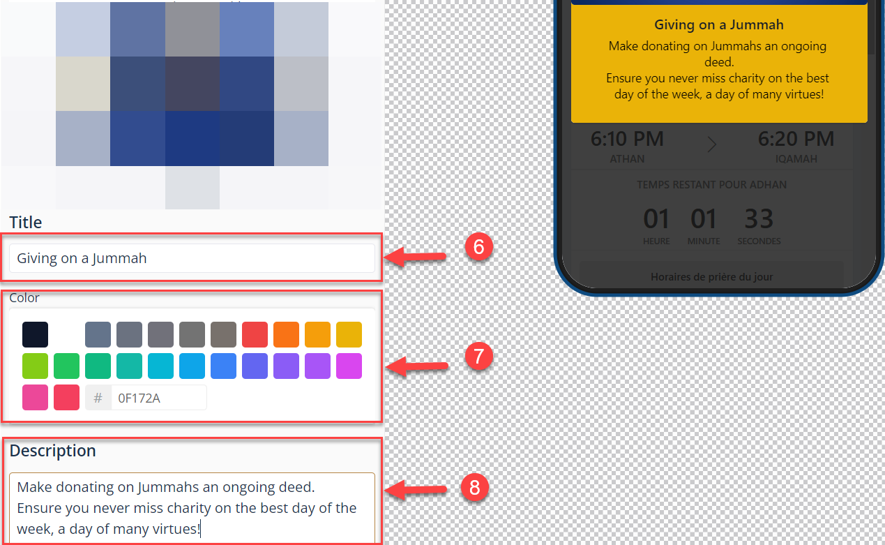 Enter the text of the Popup⁽⁶⁾, the color of the text⁽⁷⁾, and the description⁽⁸⁾