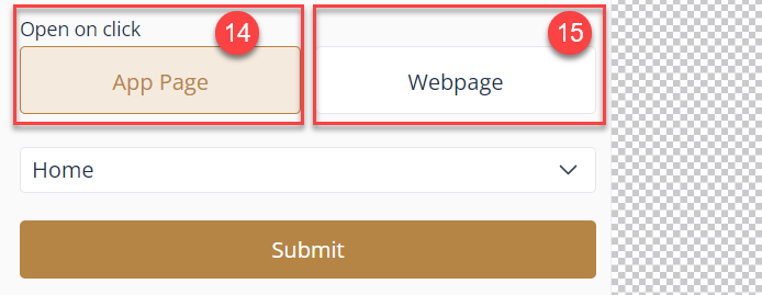 Choose App Page to add a page that you previously created⁽¹⁴⁾, or choose a Webpage and add a link⁽¹⁵⁾