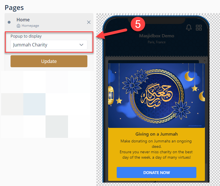 Choose the Popup you already created⁽⁵⁾ and click on update.