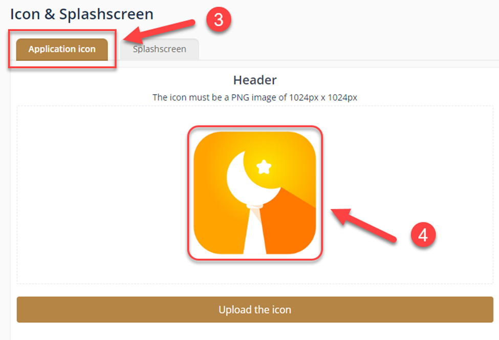 Click on the Application icon⁽³⁾ and upload your desired icon⁽⁴⁾, then click on Upload the icon. NOTE: The icon must be a PNG image of 1024px x 1024px