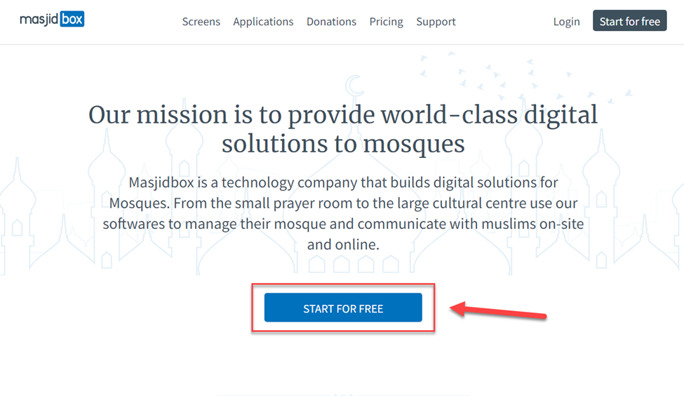 • To create a new Masjidbox account, click the link below or click Start for free. https://dashboard.masjidbox.com/register