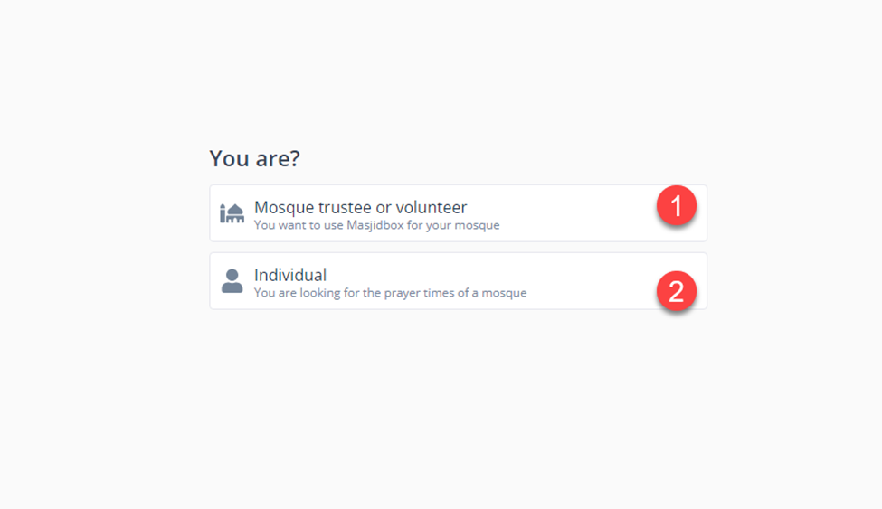 • If you want to use Masjidbox for your mosque, please choose number ⁽¹⁾, and if you are looking ONLY for prayer times for a specific mosque you can choose number ⁽²⁾