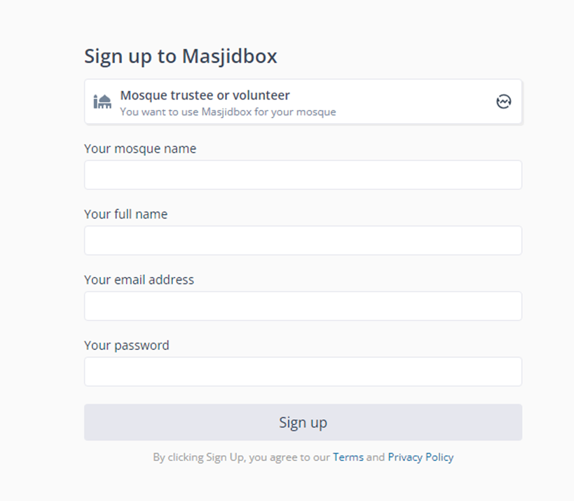 • To sign up as a volunteer, you need to enter the mosque’s name, full name, email address, and password then click on Sign up.