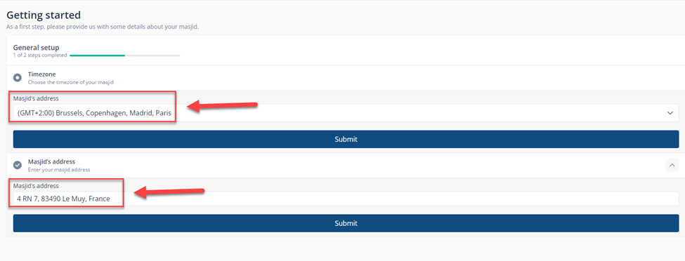 • Now, you will have to enter the mosque’s address and the time zone then click on submit.