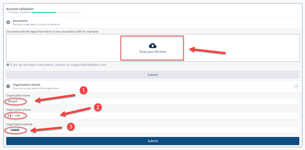 • Enter your organization’s details, the name ⁽¹⁾, phone number ⁽²⁾, and the website ⁽³⁾ if you have one then upload any documents or bills, make sure they have the legal information of your organization, and click on submit. ${color}[#ec1818](NOTE: Our team will review the documents uploaded and approve the account as soon as possible_ _)