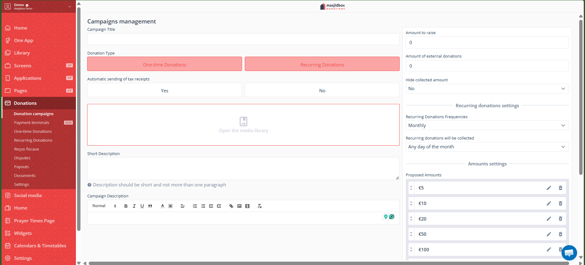 A weekly Jumuah campaign lets congregants donate every Friday, building consistent support for your mosque. You can set suggested amounts, track progress toward a goal, and enable recurring donations so donors contribute automatically each week.