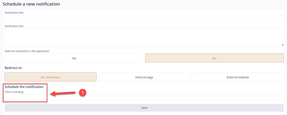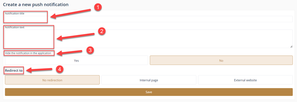 Enter the notification title⁽¹⁾, and the text of the notification⁽²⁾, choose if you want to hide the notification or not (YES/NO) ⁽³⁾ and the last option is redirection⁽⁴⁾ if you have an internal page or an external website.