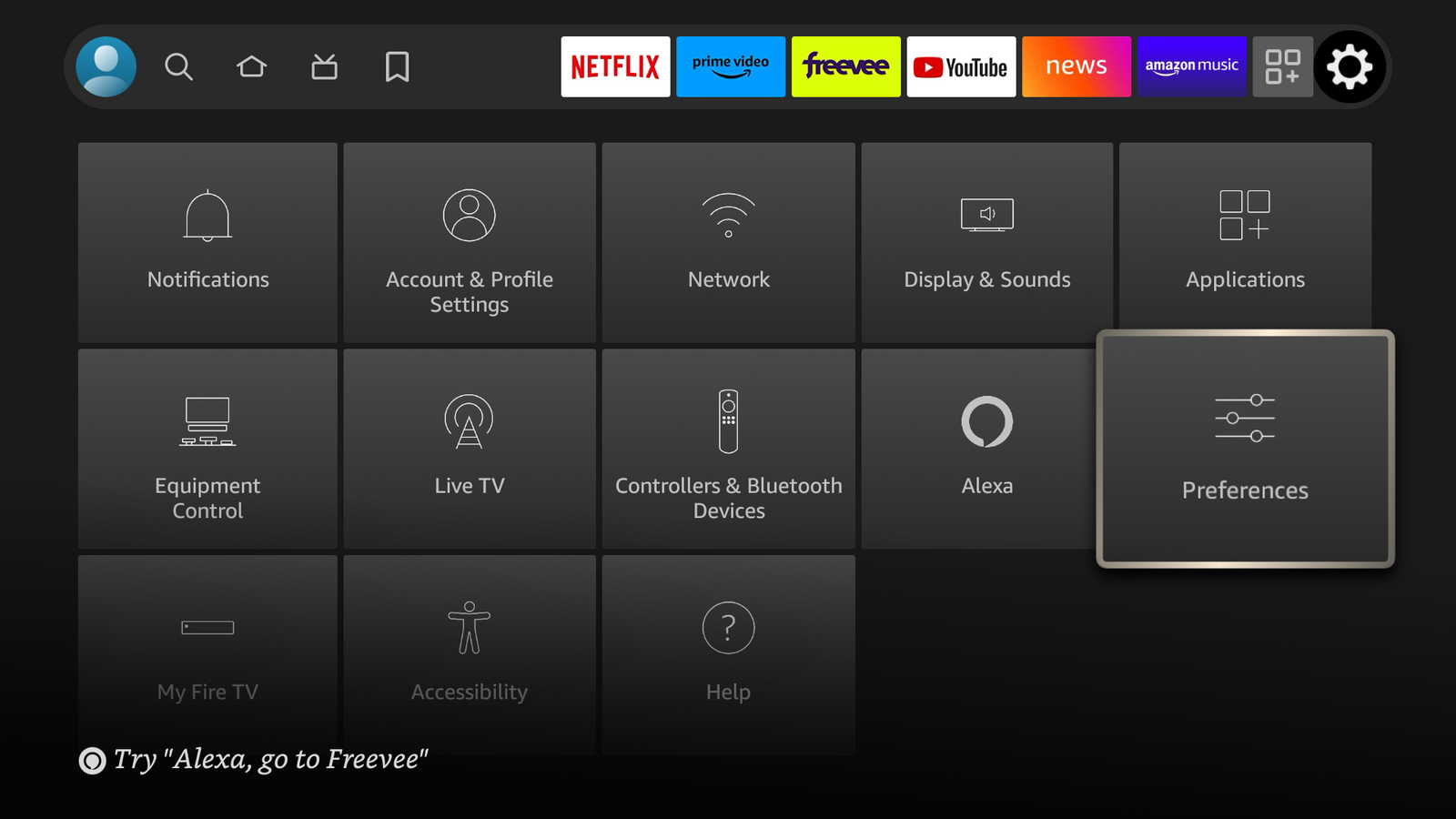 From the Fire TV home screen, press the "⚙️" to pull up the system settings dashboard. Then press "Preferences".