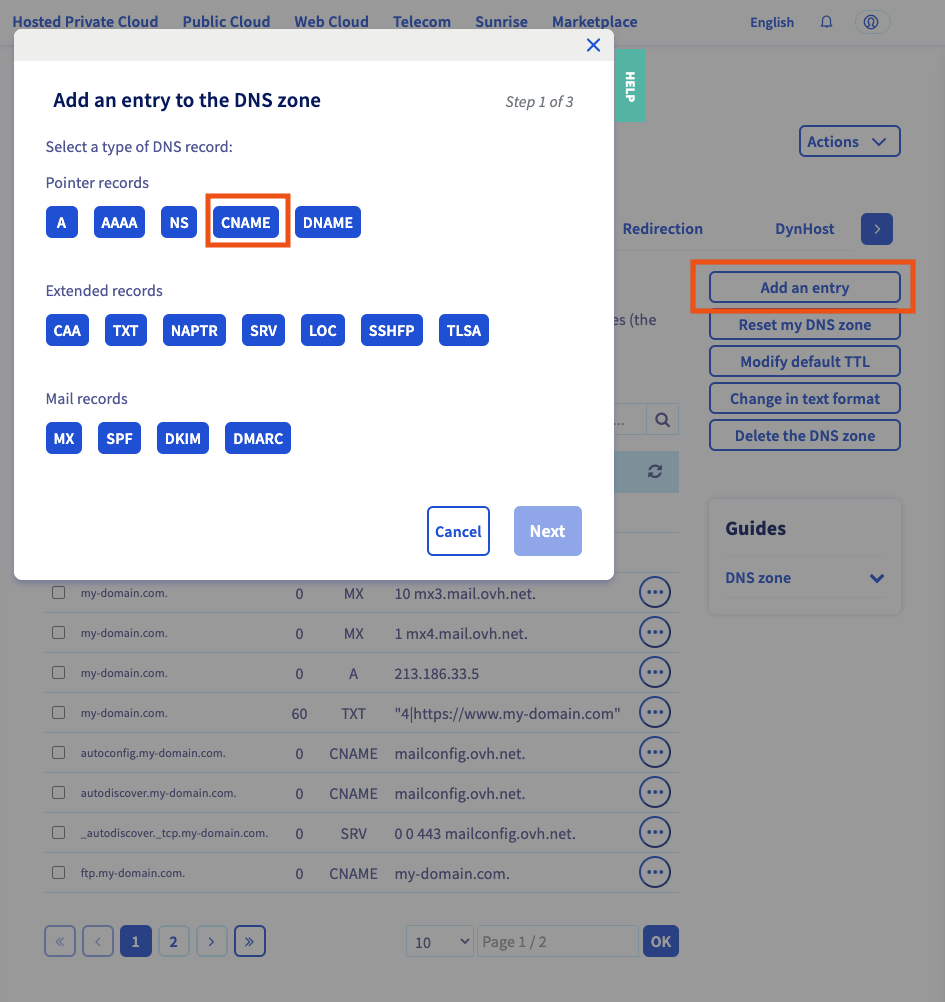 Click on add an entry button, choose CNAME