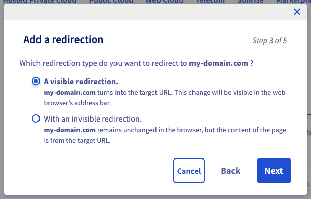 Select "a visible redirection" and click on Next