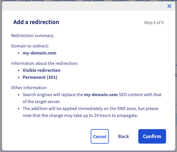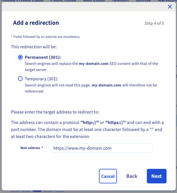 Select "Permanent" , add https://www.my-domain.com as the web address, and click on Next