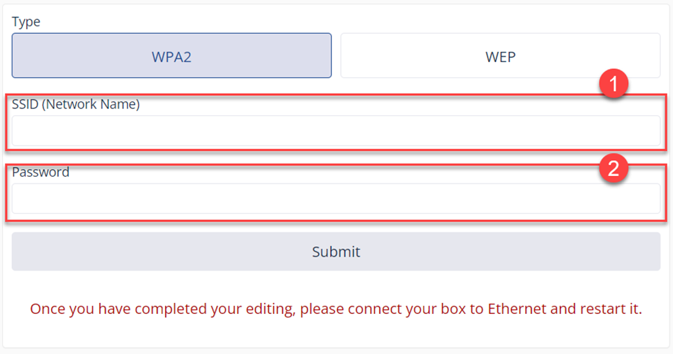 Choose either WPA2 or WEP and enter the SSID (Network Name) & the Password, then click on submit.