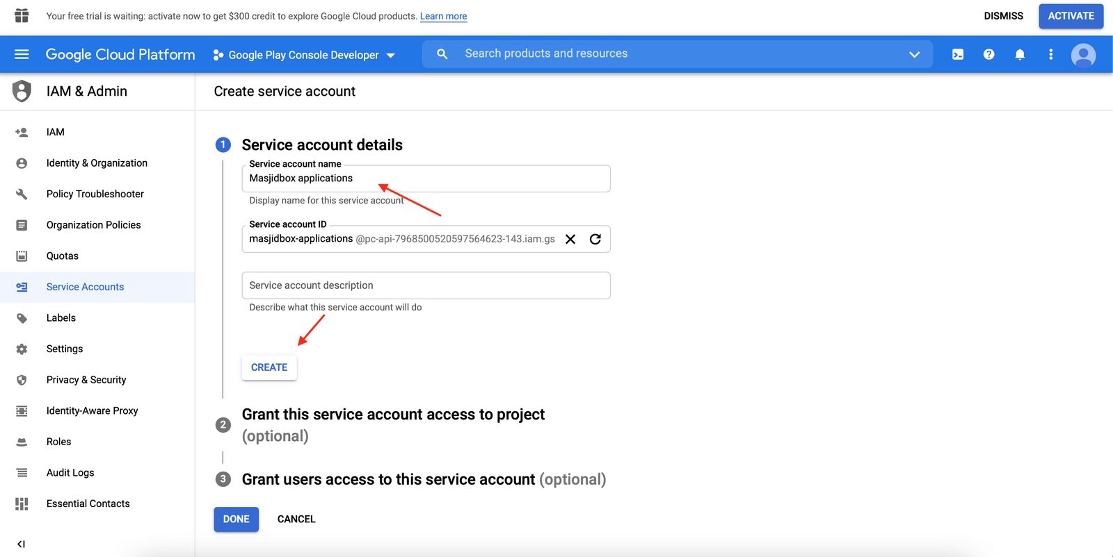 Enter the Service Account Name as Masjidbox Applications and click on Create and continue button