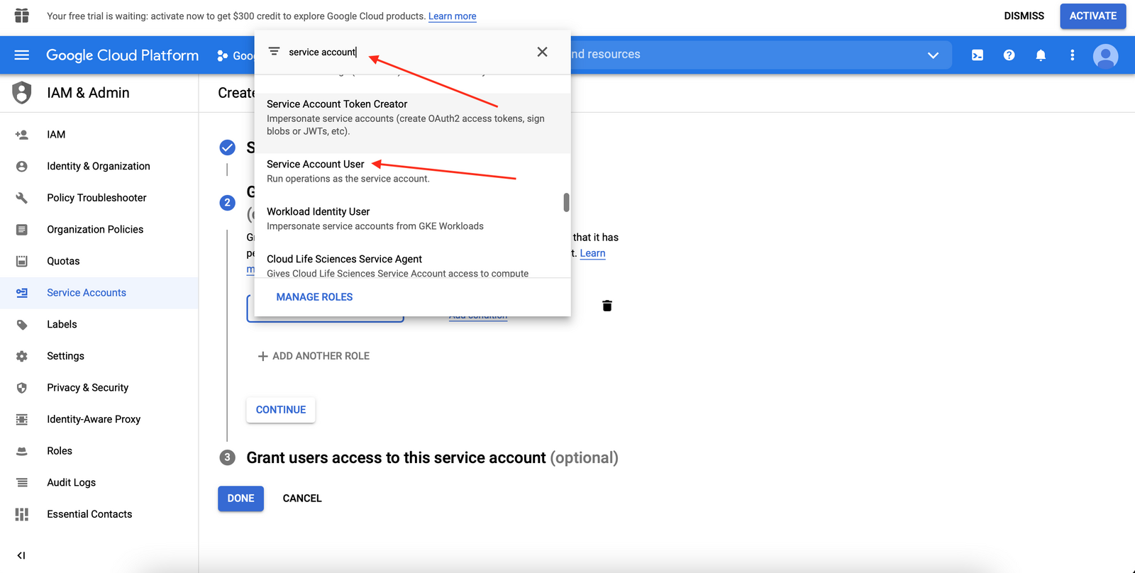 Click on Select a role box, search for Service Account User